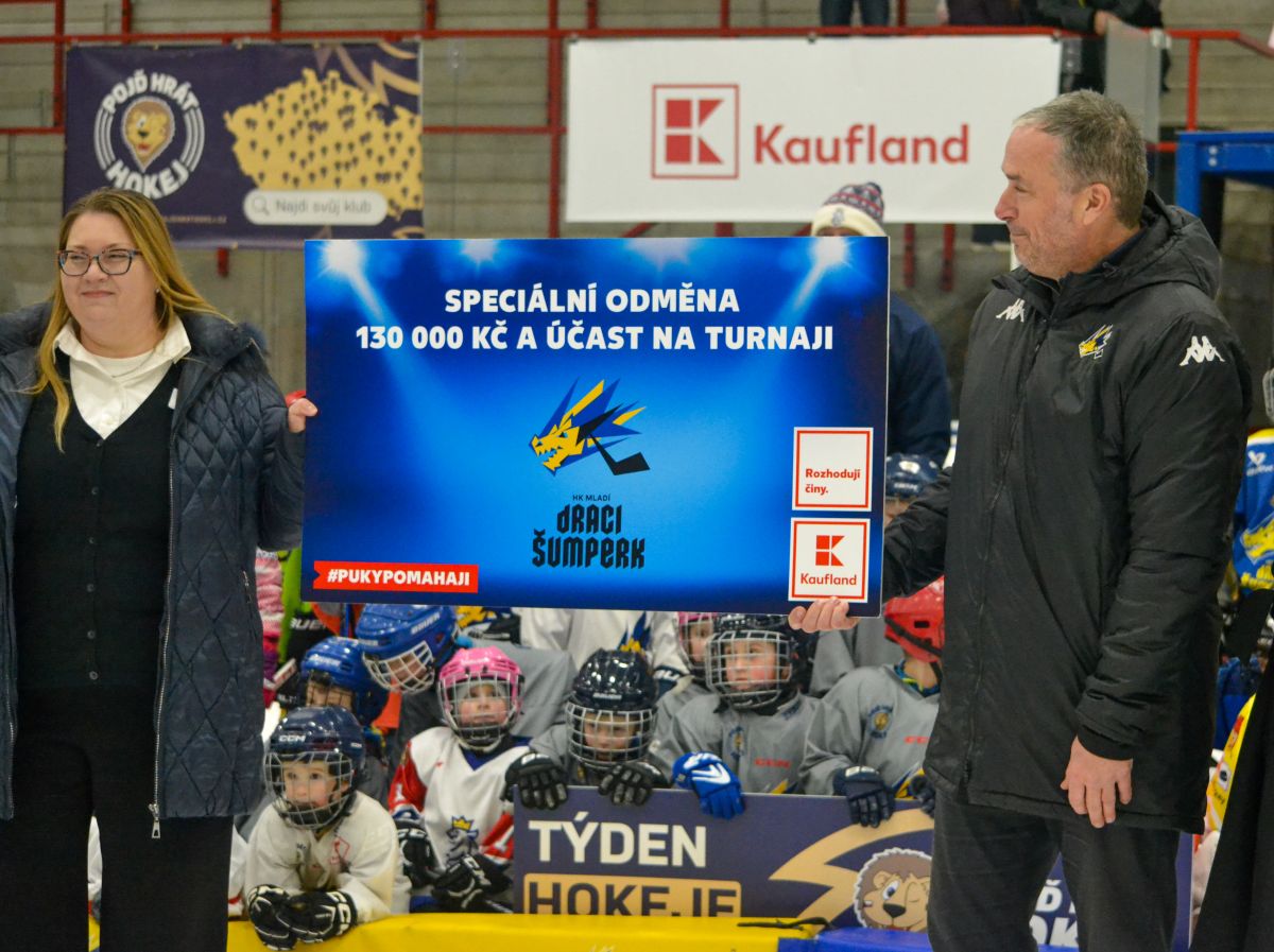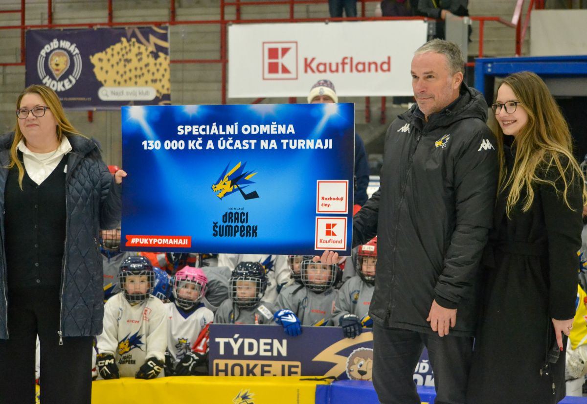 Aktivity na ledě na chvíli přerušilo slavnostní předání šeku od společnosti Kaufland za vítězství v hlasování v rámci ankety Puky pomáhají. Klub převzal šek v hodnotě 130 000 Kč, který bude využit na podporu trenérského zajištění a pořízení turnajových dresů. Zástupci společnosti Kaufland zároveň pozvali kategorii U9 k účasti na celorepublikovém turnaji Kaufland Puky pomáhají, jenž se uskuteční na jaře. Šek osobně předali zástupci společnosti Kaufland společně s vedením šumperské prodejny a při této příležitosti byla pořízena také společná fotografie všech účastníků. Celý průběh akce dokumentoval mediální tým Českého hokeje.
